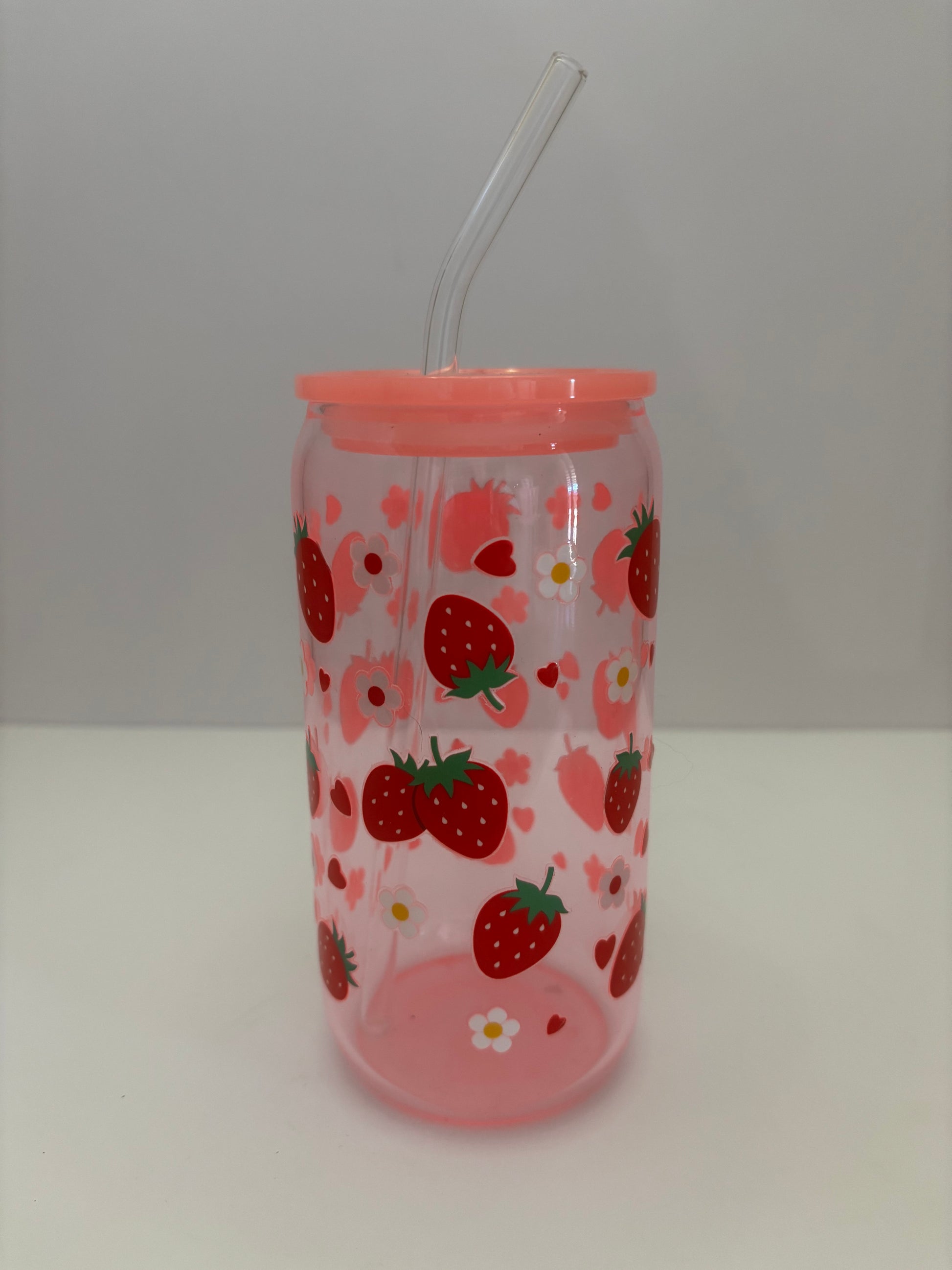 Our 16oz Clear Pink Glass Tumbler is sprinkled with charming strawberry illustrations and topped with a matching pink glass lid and clear straw—perfect for adding a touch of sweetness to your daily hydration.