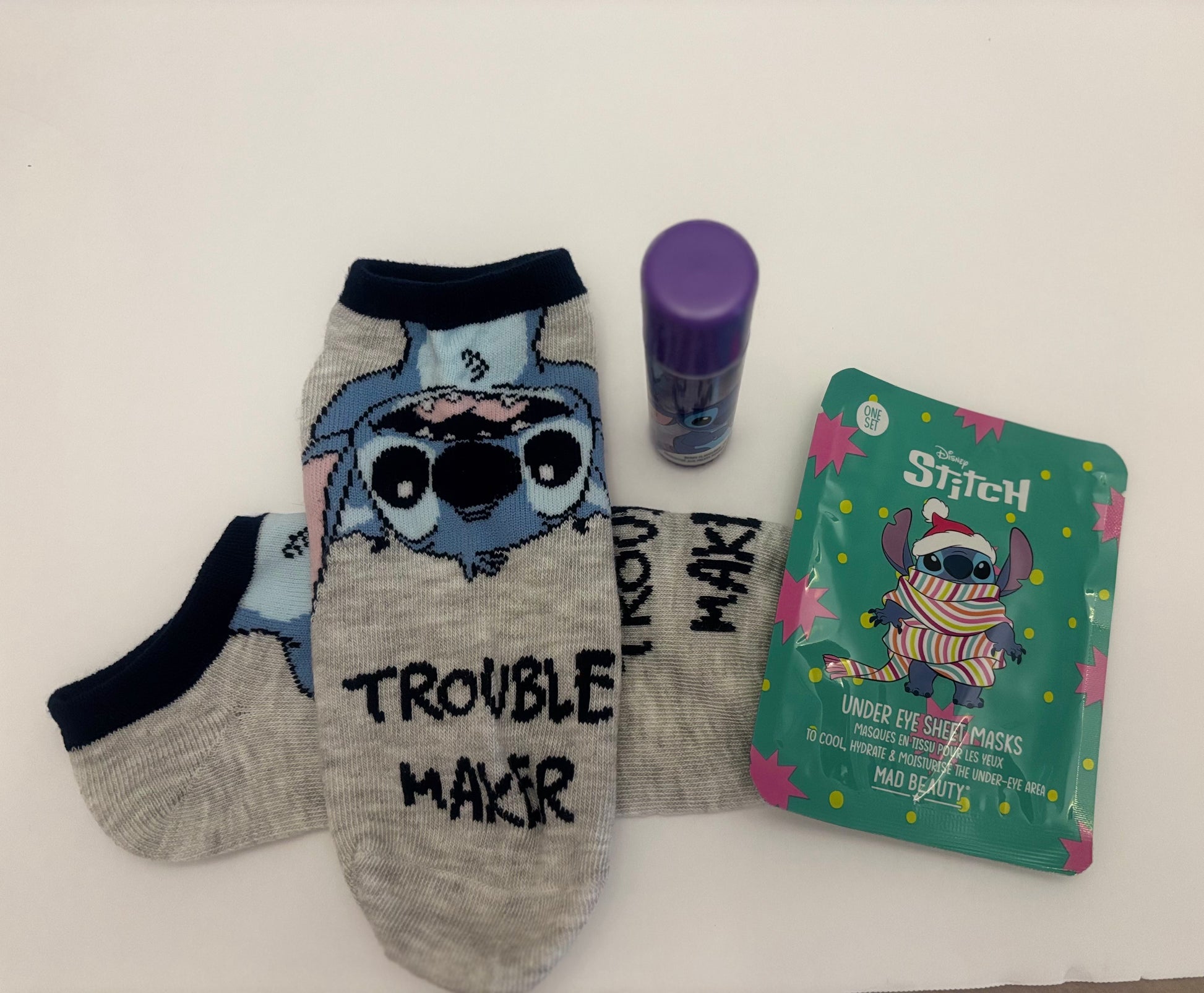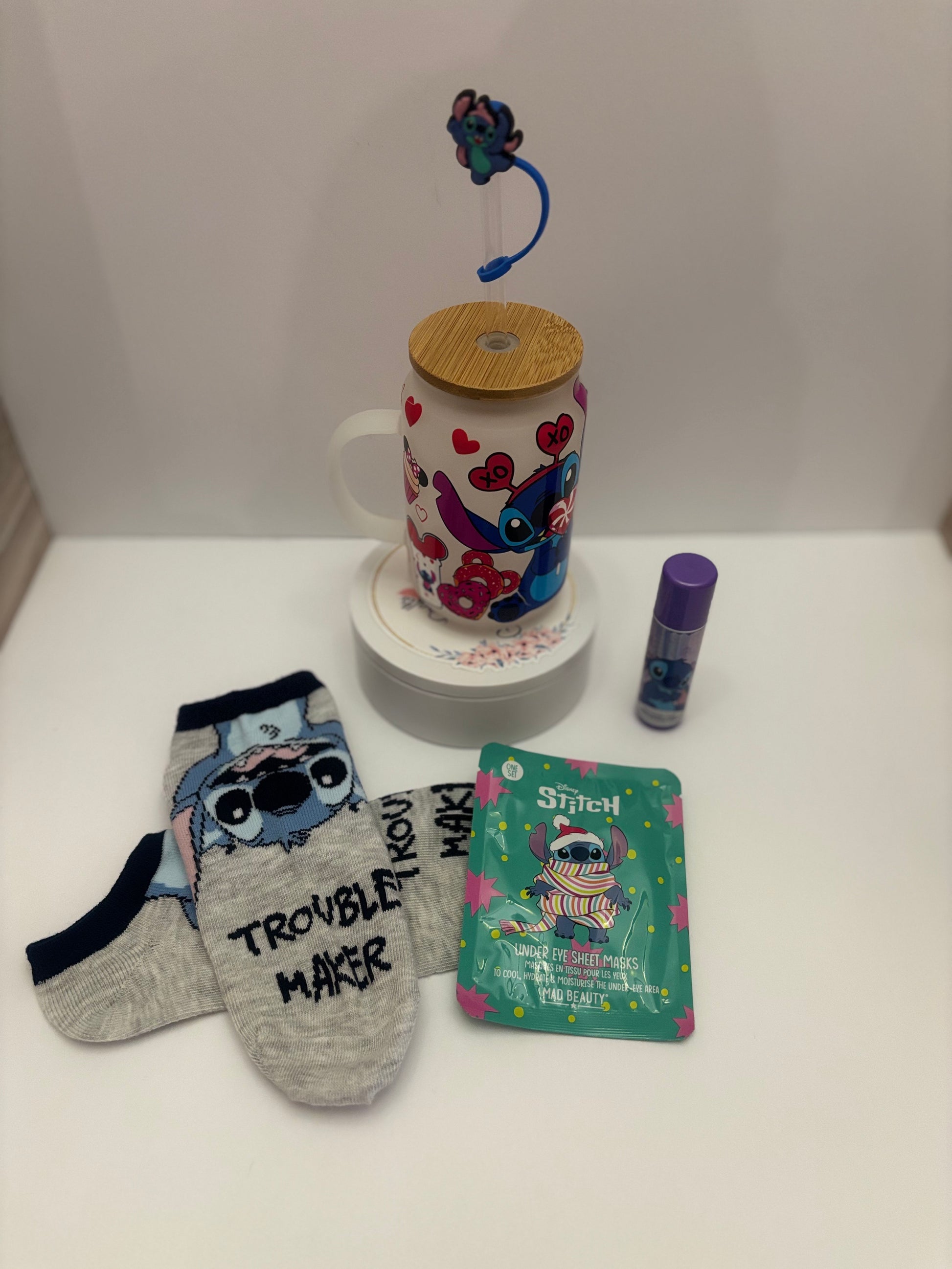 Celebrate comfort and character with the Blue Space Buddy Cozy Bundle. This gentle set features a 16 oz frosted glass tumbler with handle, decorated in a Stitch-inspired wrap, topped with a bamboo lid and glass straw.