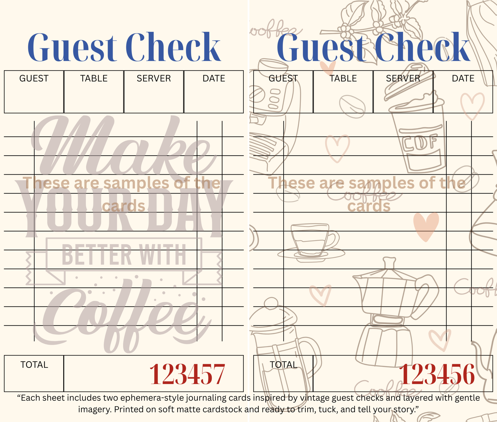 A cozy blend of steaming mugs scattered beans, and handwritten warmth—these softly styled journaling pieces are inspired by vintage guest checks and reimagined for quiet mornings and storybook spreads.