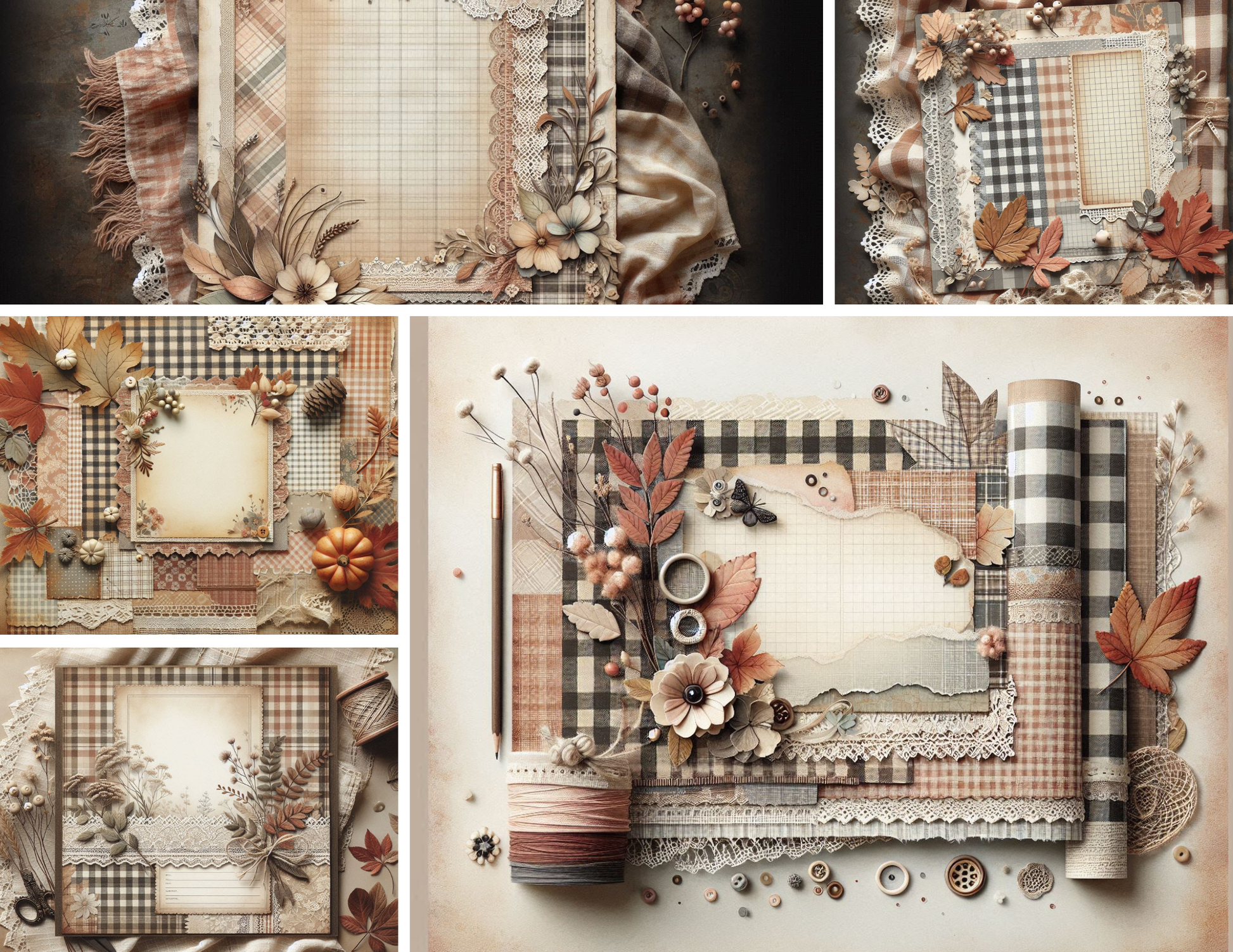 A bundle of soft gingham and plaid pages in warm, muted fall tones—rust, olive, gold, and taupe—styled for gentle journaling and seasonal crafting.