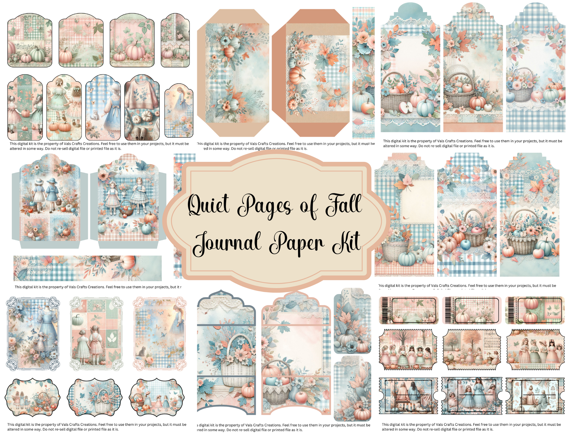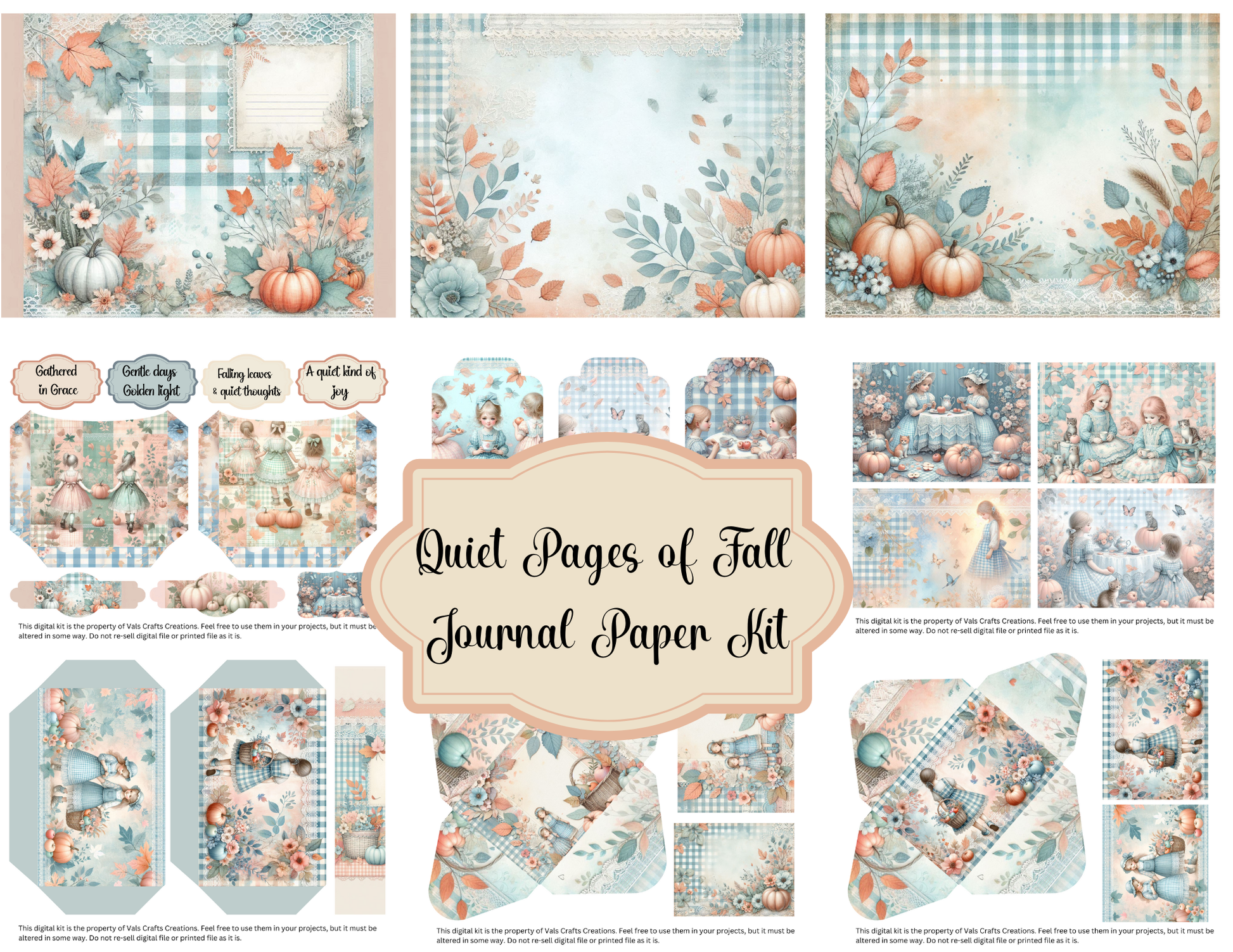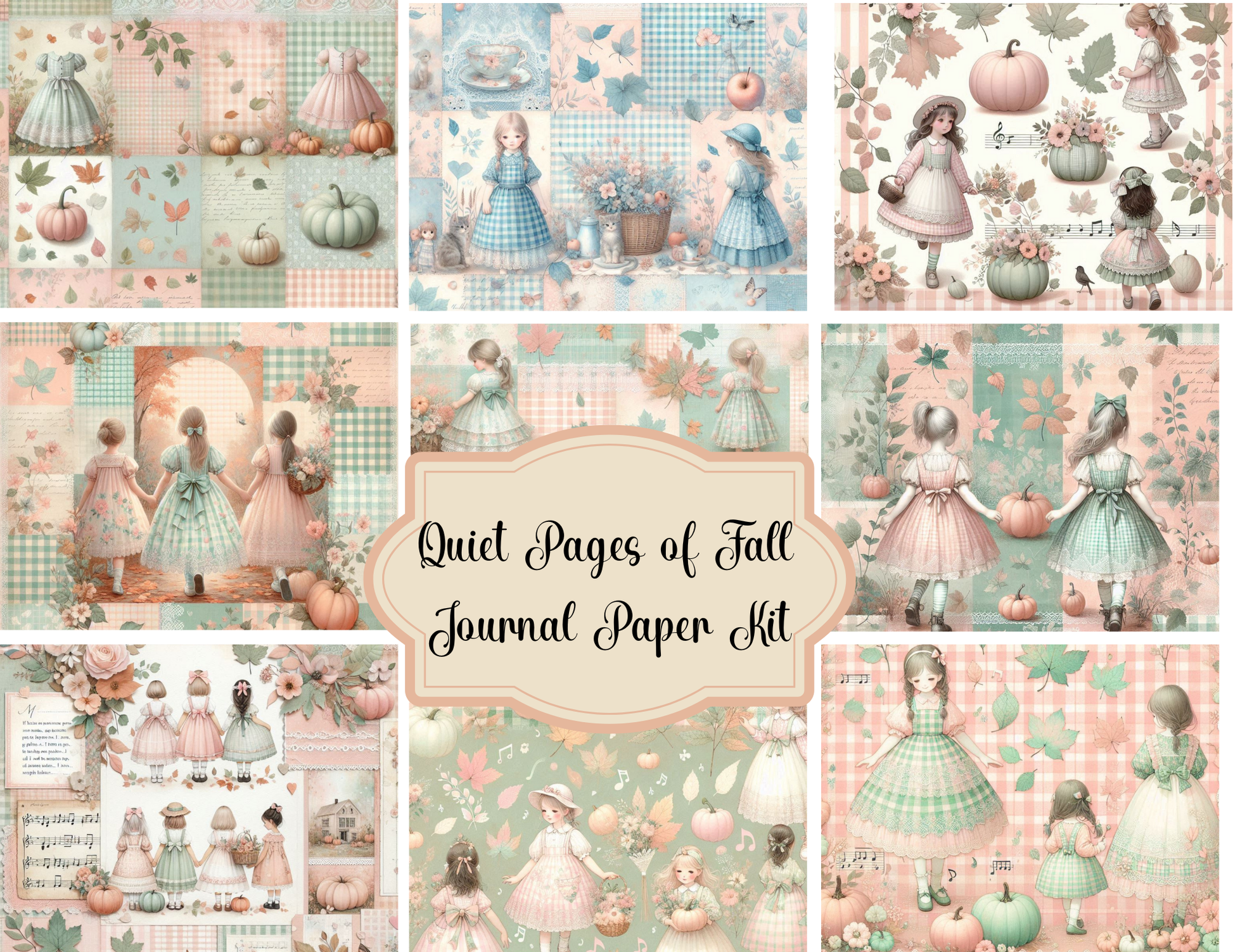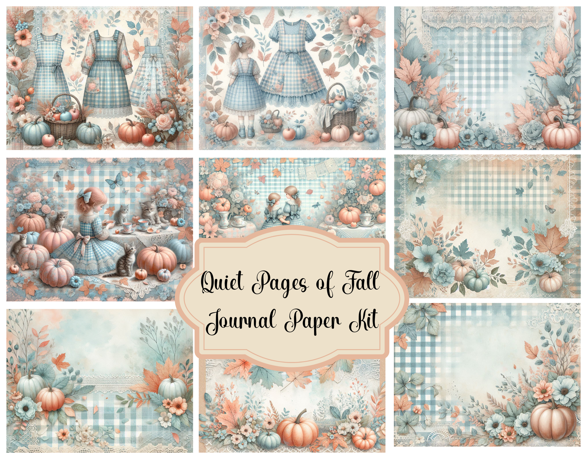Dive into the season of softness with this vintage-inspired fall paper kit. Perfect for cozy journaling and heartfelt creativity, it includes 50 background pages. These feature powder blue and blush gingham, lace overlays, faded leaf silhouettes, and watercolor florals in gentle autumn tones. Each page invites you to savor the beauty of fall.