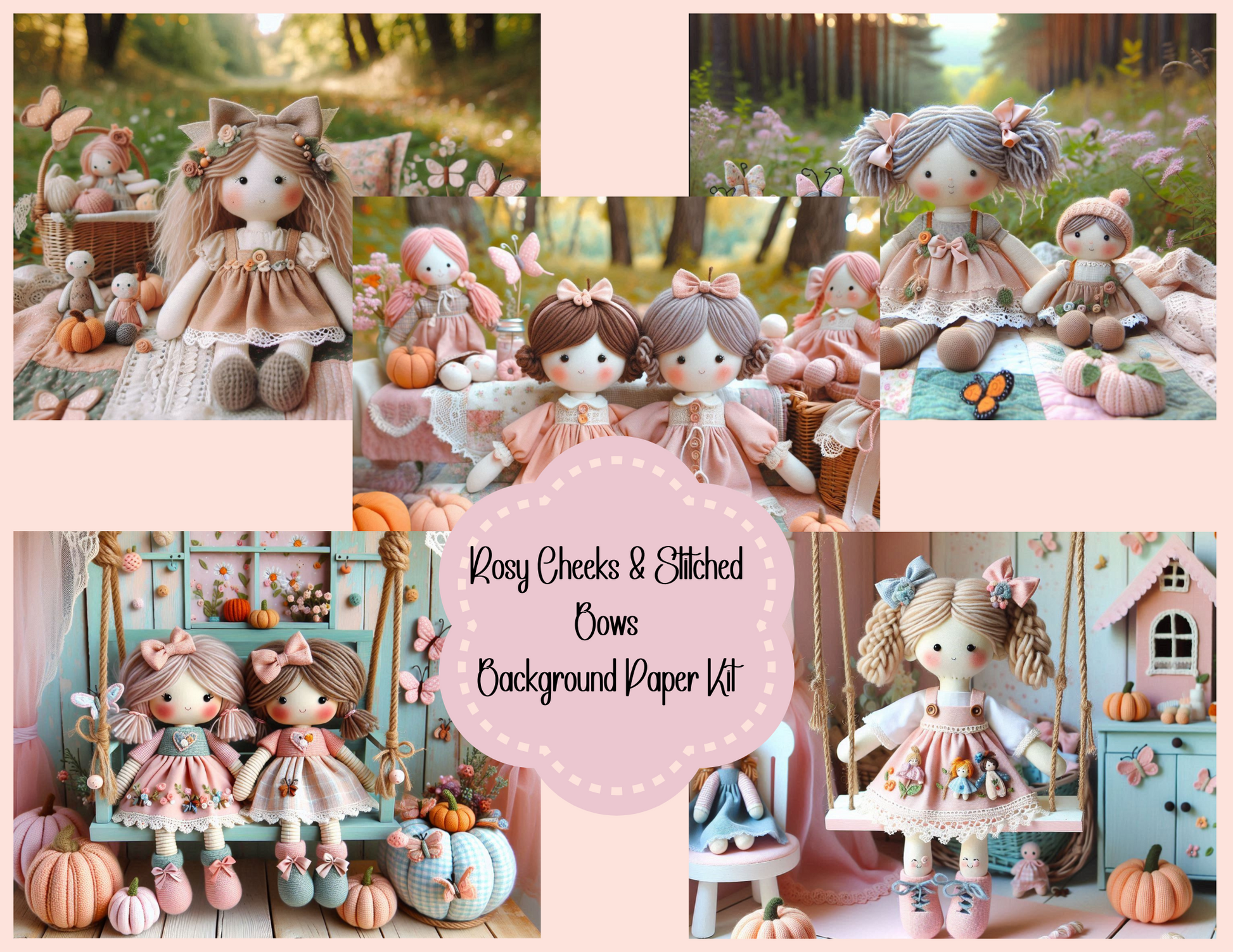 Step into a stitched-up storybook world where cloth dolls gather in quiet companionship and watercolor skies peek through vintage shutters. This 40-page background paper kit is a celebration of softness, nostalgia, and handmade sweetness.