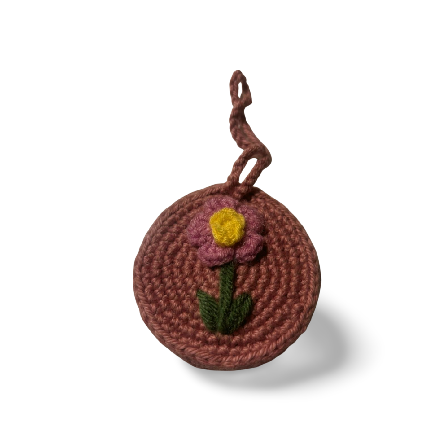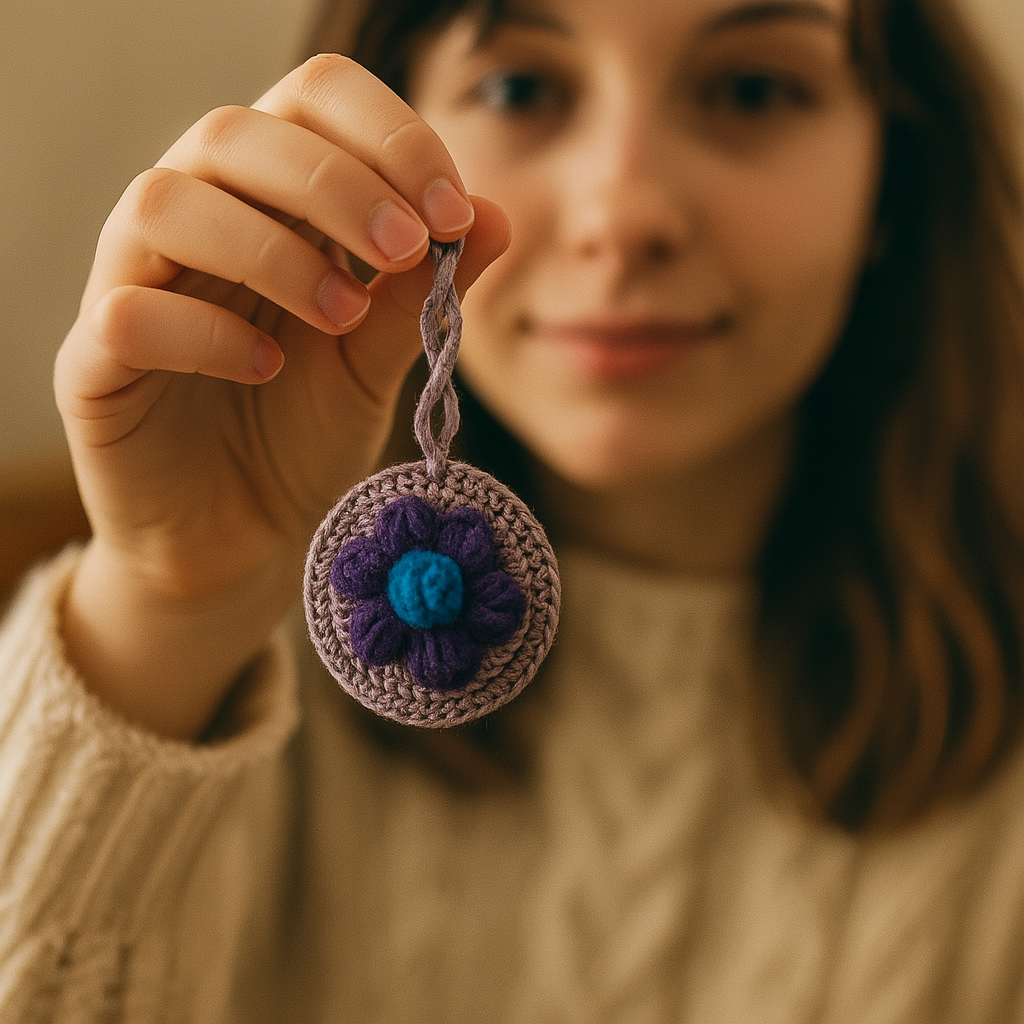 💜 Lavender Bloom: A light purple base cradles a deep violet flower—like twilight in yarn form. This charm carries the calm of lavender fields and the quiet joy of handmade beauty.